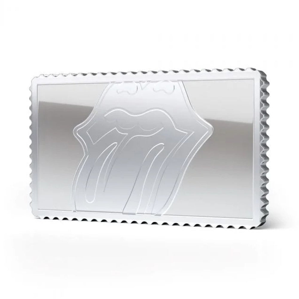 The reverse is proof-stamped with the Rolling Stones' iconic tongue and lips logo and is hallmarked to verify the silver content.