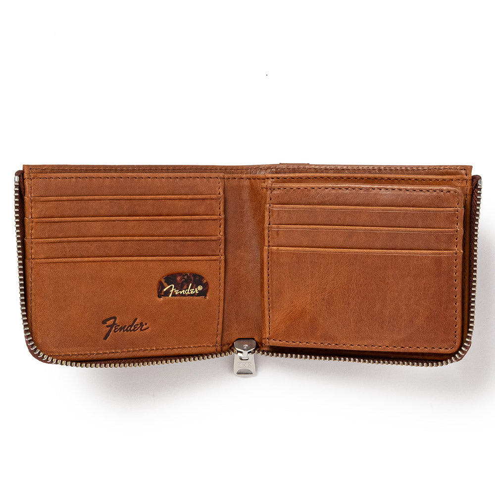 An L-shaped zipper bi-fold wallet made from domestically produced tanned leather from Fender, a world-renowned musical instrument manufacturer.