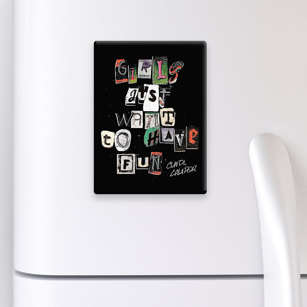 80年代ポップカルチャーの象徴、シンディ・ローパーの代表曲"Girls Just Want to Have Fun"をフィーチャーした公式マグネット。