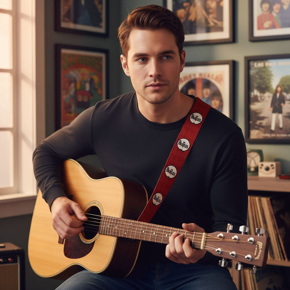 ザ・ビートルズの象徴的な“Drop T Drum”ロゴをあしらった、鮮やかなレッドのギターストラップ。