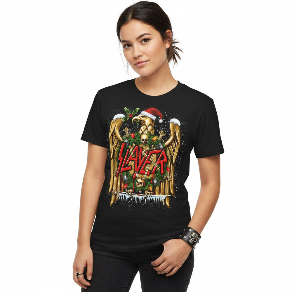 ブランドを象徴するイーグルモチーフに、サンタ帽やクリスマスリースを組み合わせ、SLAYERらしいヘヴィメタルの世界観とホリデームードを融合したデザインです。