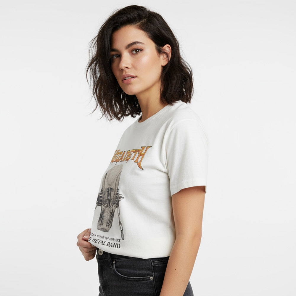 フロントには、重厚感のあるスカルとチェーンのアート、そしてアイコニックなMEGADETHロゴが映えるデザインで、メタルファンには欠かせない定番のグラフィックです。