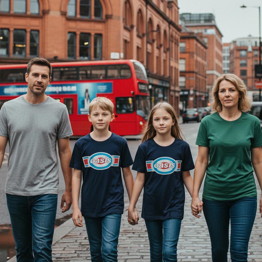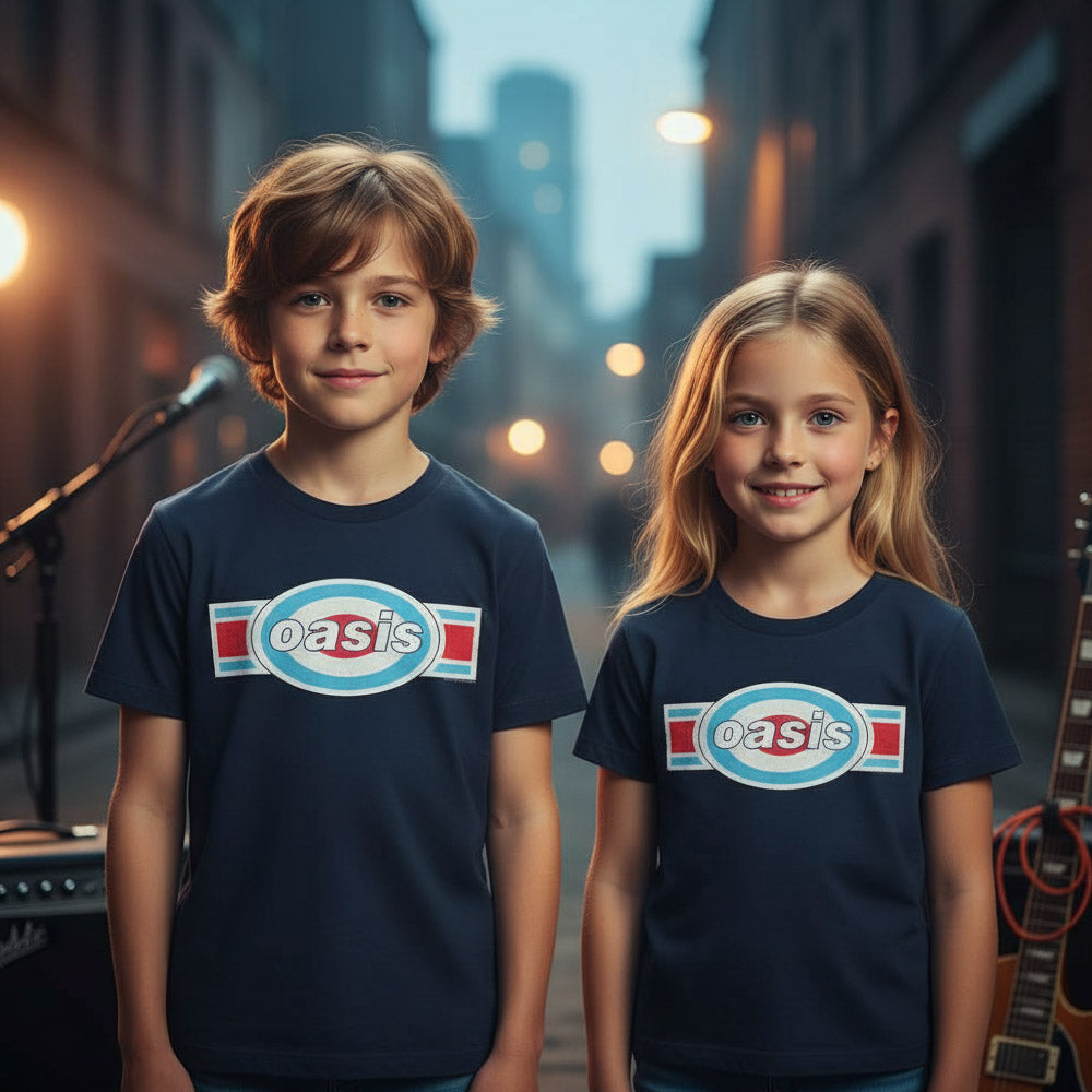 英国ロックバンドOASISのトリコロールロゴを胸元に配置した、シンプルながら存在感のあるジュニア向けTシャツです。