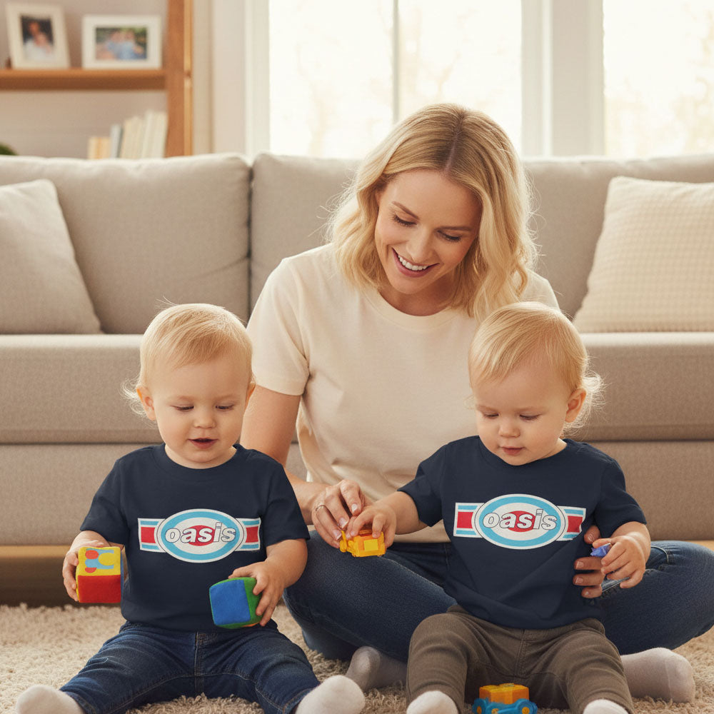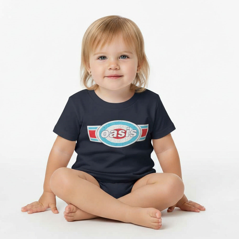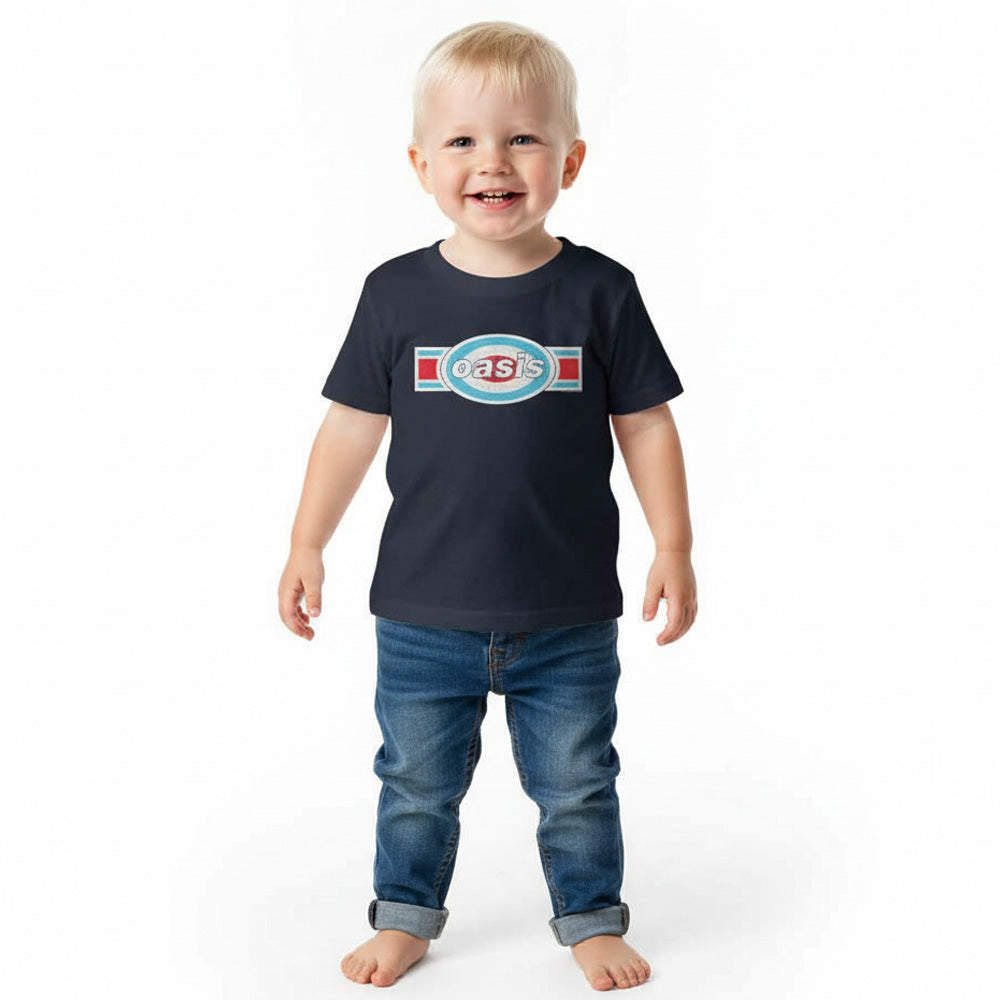 英国ロックバンドOASISの象徴的なロゴを配した、トドラー向けのオフィシャルTシャツです。