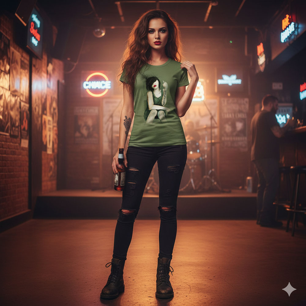 ミリタリー調のグリーンボディに、感情を感じさせるアートワークが映え、ライブTシャツでありながらファッション性も非常に高い仕上がり。