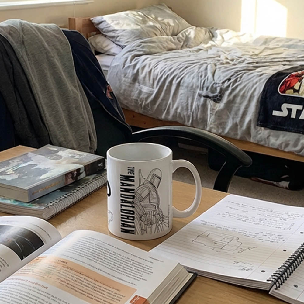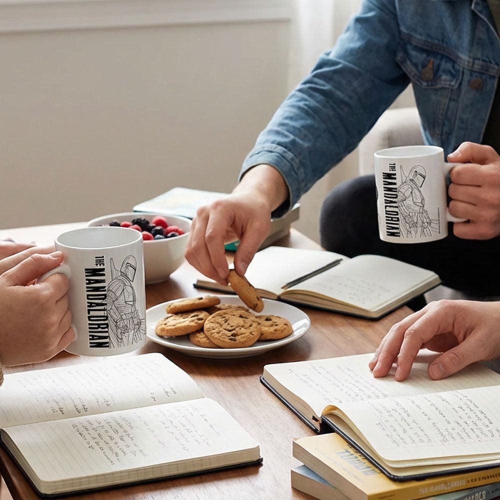 A white ceramic mug featuring STAR WARS "The Mandalorian" in stylish line art.