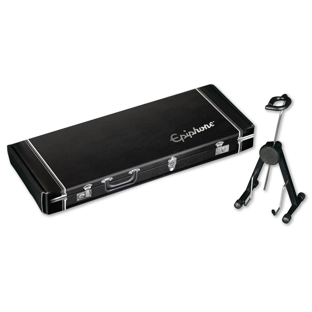 木製ボディに金属製ペグを備え、全長約25cm(10インチ)の存在感あるサイズ。付属の高品質ミニチュア調整式Aフレームスタンドと、ブルースエード調の内装を施したゴールド箔押しEpiphoneギターケース型ギフトボックスで、美しくディスプレイできます。