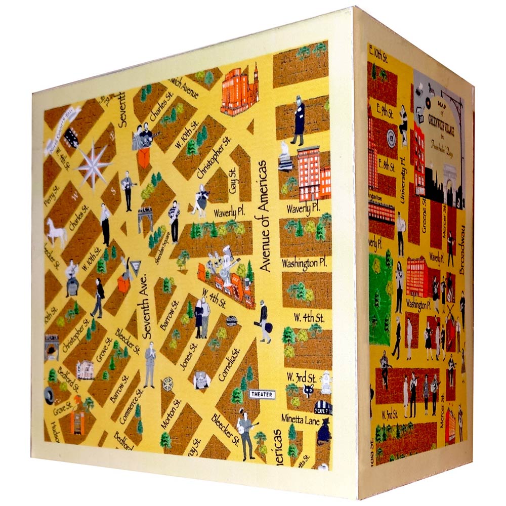 ジオラマの外面は当時のグリニッチヴィレッジの地図 with 当時のDylan所縁の場所や人々を彷彿とさせるトリビア風マップ柄。
