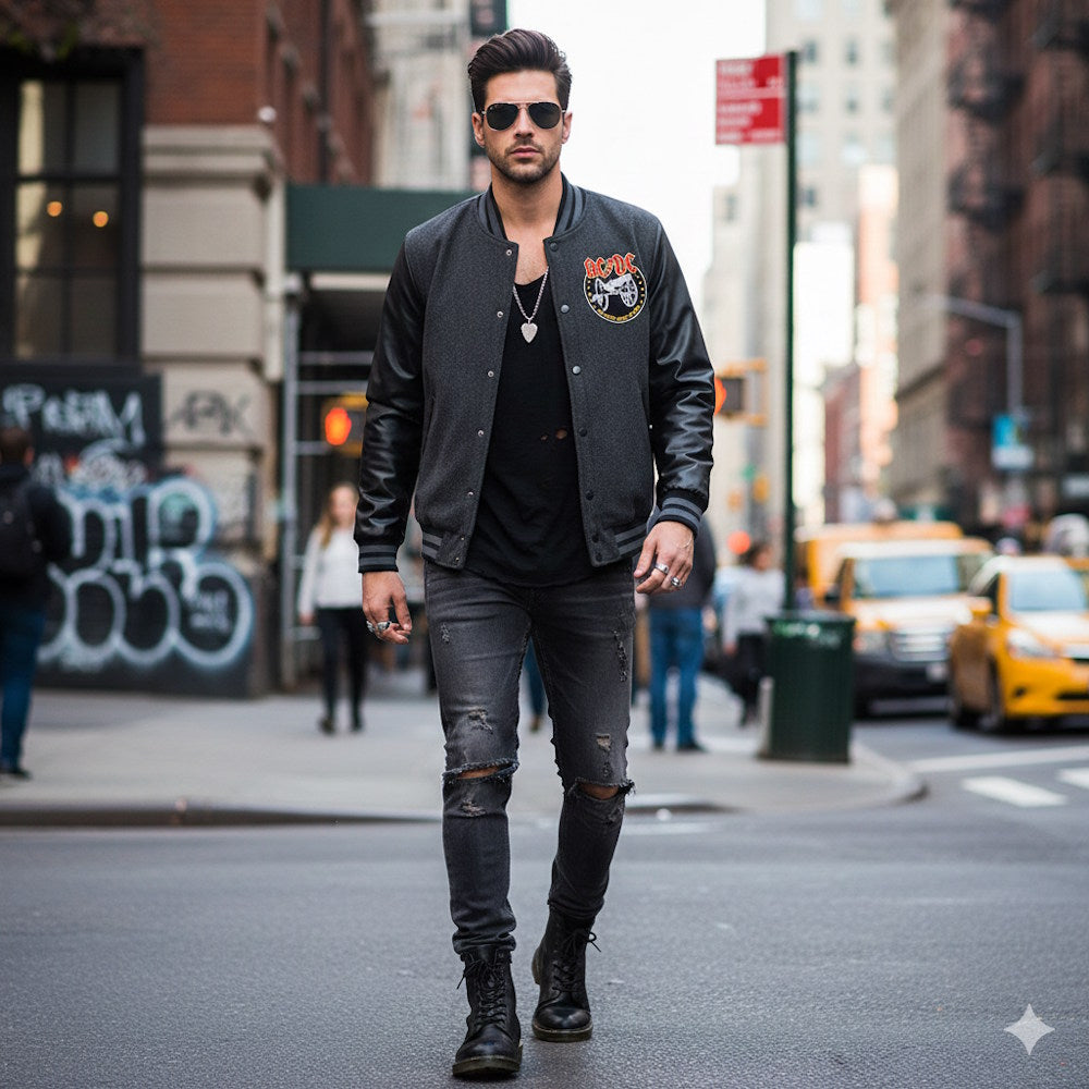 袖: **レザー風(Leather Look)**の袖が、ロックな雰囲気を強調します。