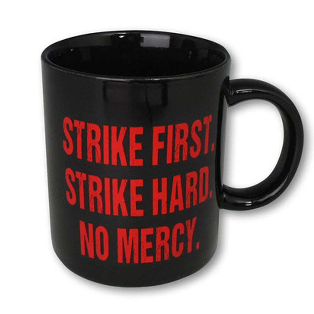 道場の看板と印象的なメッセージ、アイコンがあしらわれているCOBRA KAI公式マグカップ。