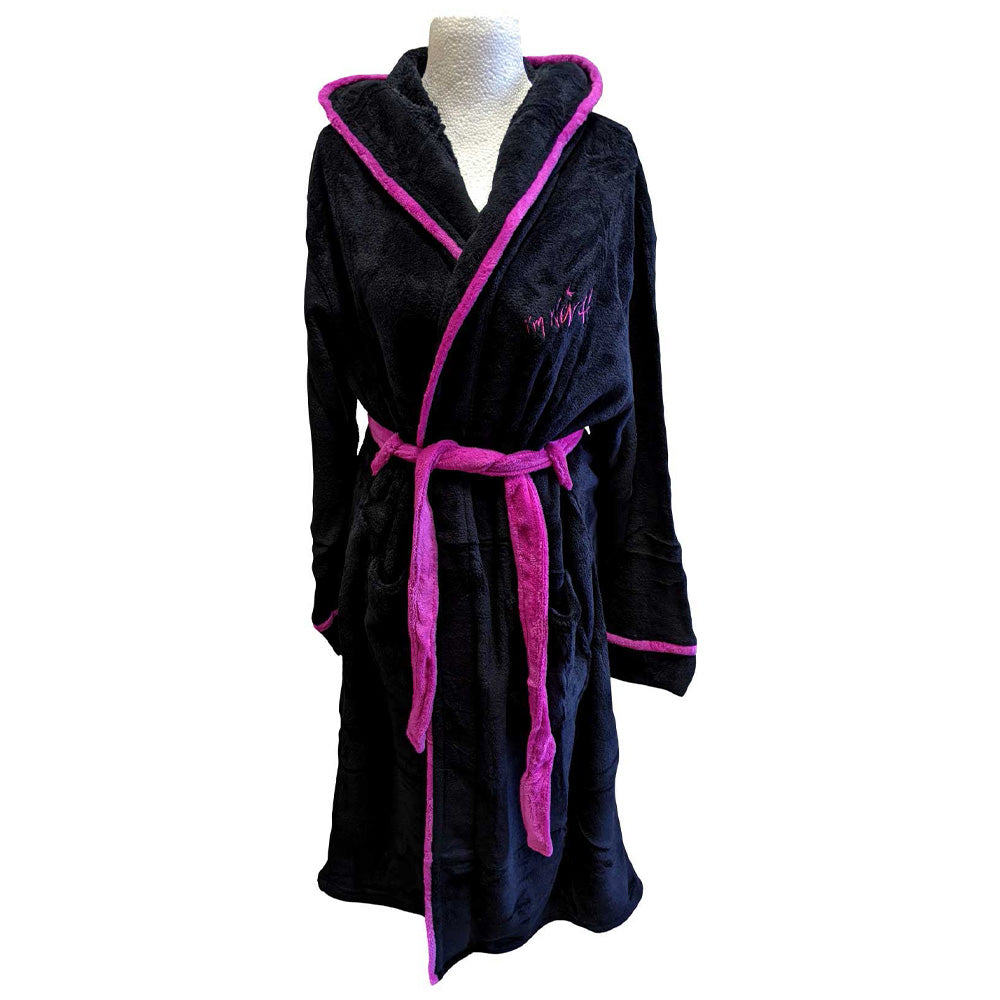 とても柔らかいフリースタオル地の黒いフード付きバスローブです。