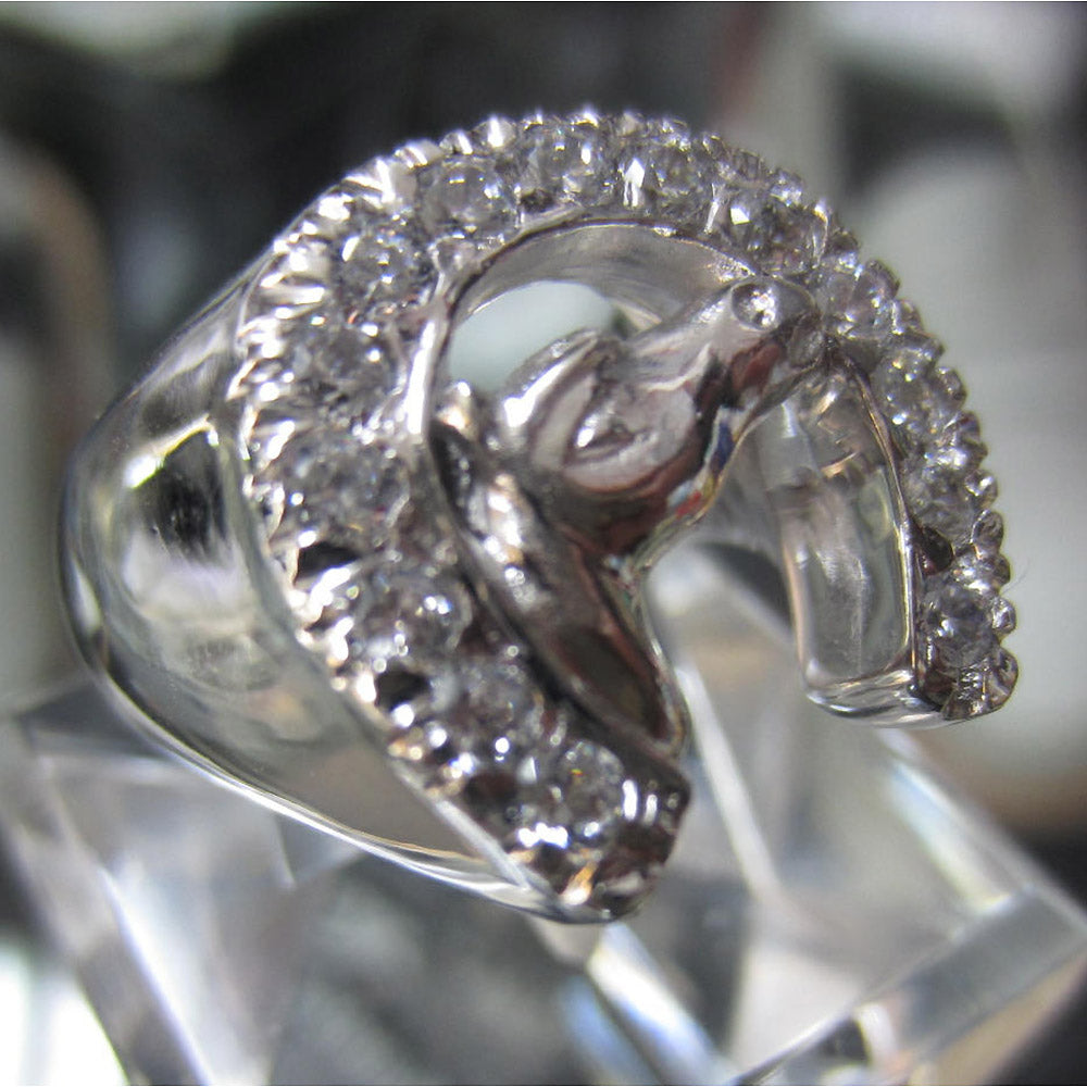 自分自身の成功の証と更なる飛躍の思いを込めこのリングを購入したことであろう。 エルヴィスのホースシューリングは同時期に発売されていたホースシューモチーフのリングとは同じようでデザインが異なる。 馬蹄のラインがだいぶ丸みを帯びている点、リングのボディに一切彫り物等がなされていない点やボディのボリューム感。 ヴィンテージジュエリーのホースシューリングで同じものが出回ったことは、今まで一度もなかった。 THE KING OF ROCK'N' ROLL の感覚に迫り、ロックの持つエネルギーが炸裂するかのような、パワーと美しさを備えた伝説のリングである! 尚、エルヴィス・プレスリーが所有した現物の行方は長年謎のベールに包まれ、「幻のHORSESHOE RING」となっていたが、メンフィスマフィアの一人、アラン・フォータス氏が所有されていた事が判明し、その後オークションにて落札された。 ELVISが最初に身に着けたリングがホースシューであれば、ホースシューリングこそROCKのRINGと言えよう。 メンズ・モデル SILVER 925 & キュービックジルコニア 対応SIZE #11〜#30 ロジウムコート仕上げ 高さ21mm 重量17g (#17の場合) MADE IN TOKYO THE KING friendly relation memorial card付きWe Accept