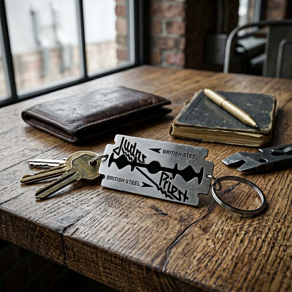 JUDAS PRIESTの名盤『British Steel』を象徴するアイコニックなデザインを落とし込んだ、インパクト抜群のキーホルダーです。
