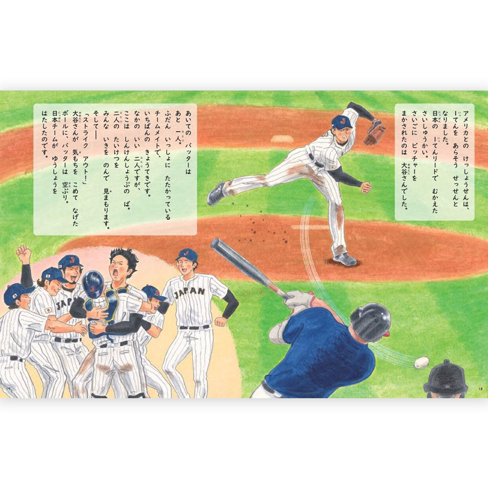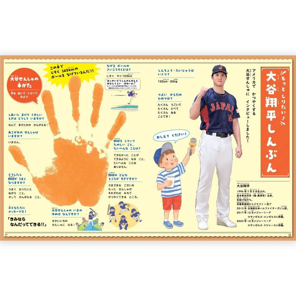 物語では幼少期から日本プロ野球、MLB、WBCでの活躍、全国小学校へのグラブ寄付、ドジャース入団までを紹介し、巻末には大谷選手のことがよくわかるインタビューや写真、手形を入れた「新聞」ページも掲載しています!