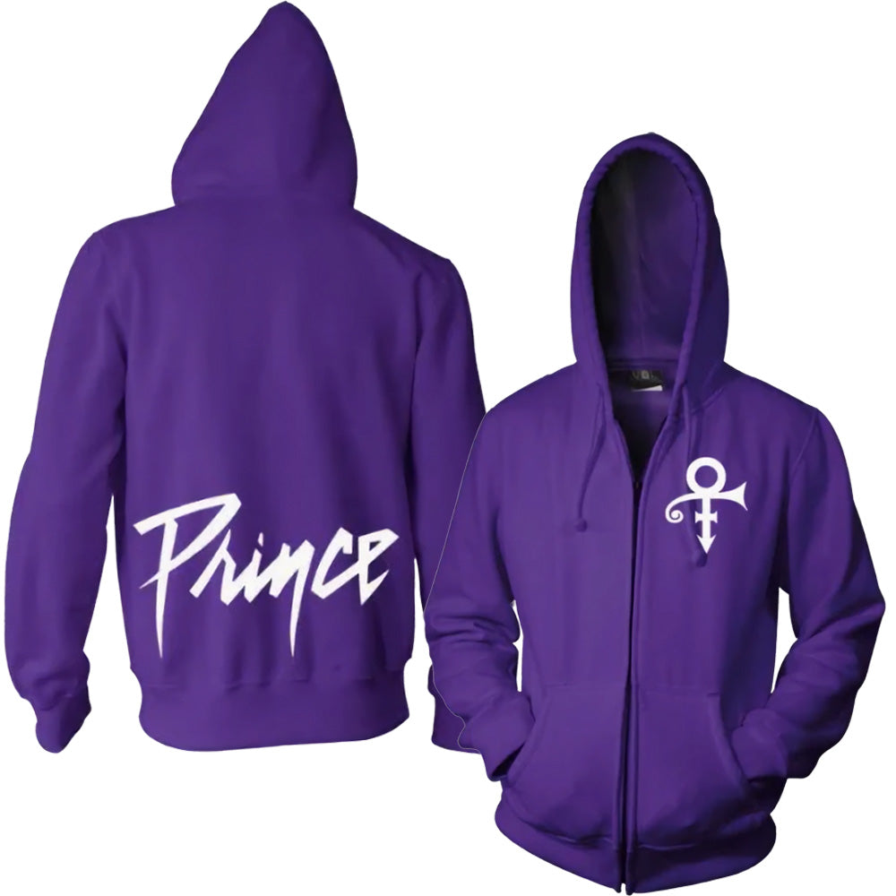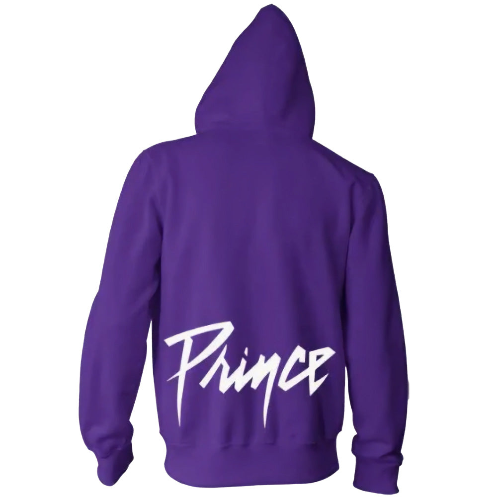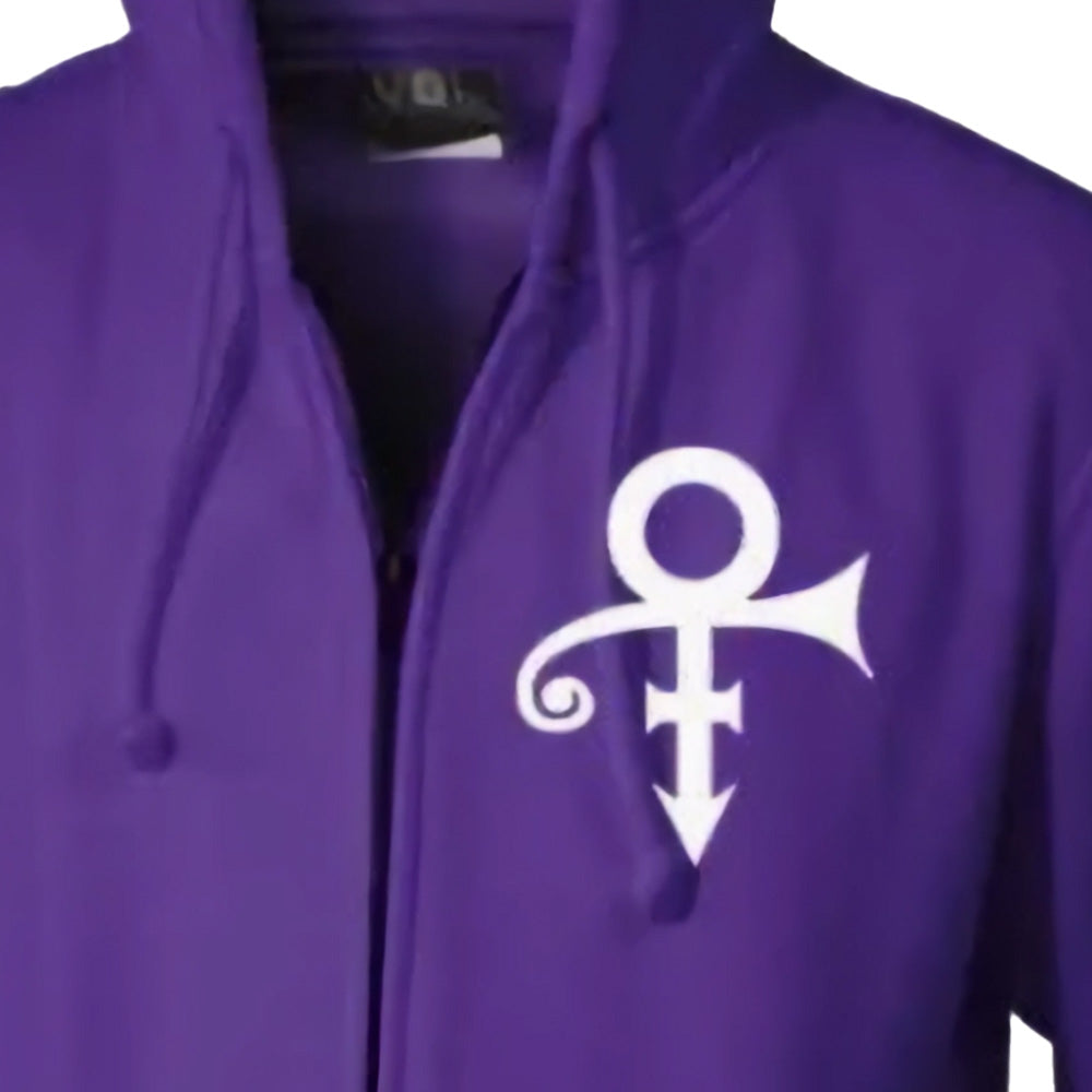 胸元に白いラブ・シンボル、背中に白いプリンスのロゴが入ったパープルのジップアップパーカーです。