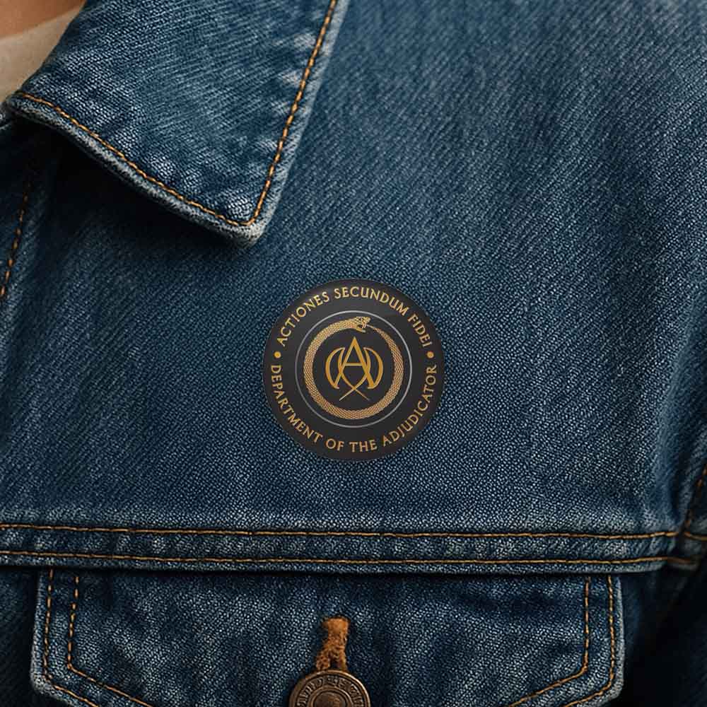映画『ジョン・ウィック』シリーズに登場する謎多き存在「アジュディケーター(裁定人)」の紋章をモチーフにした、スタイリッシュな25mmバッジ。