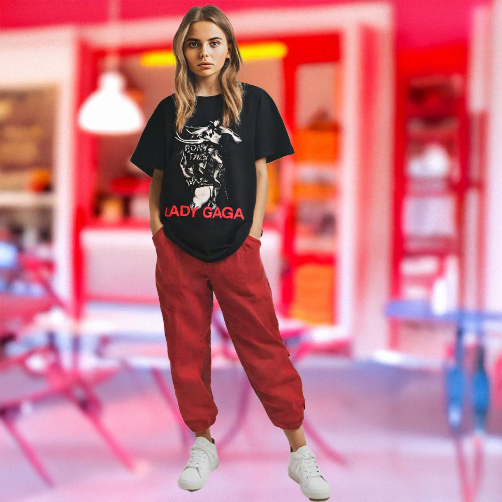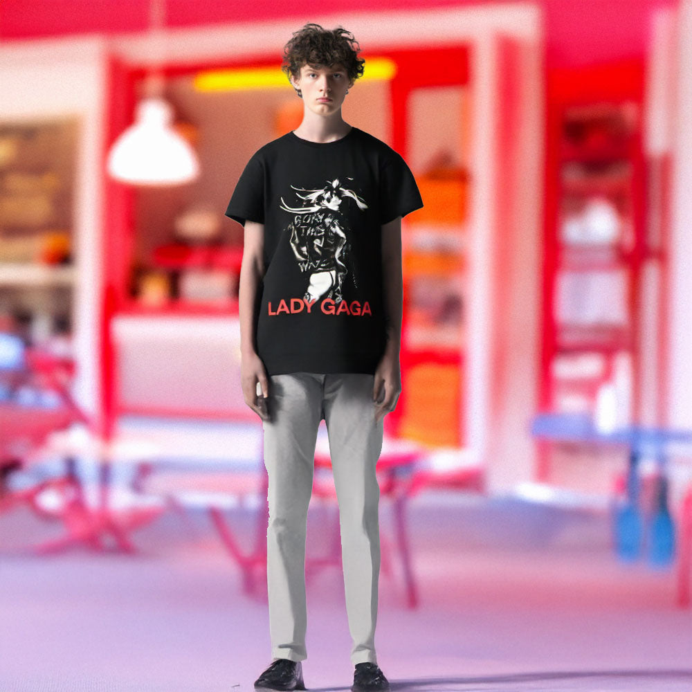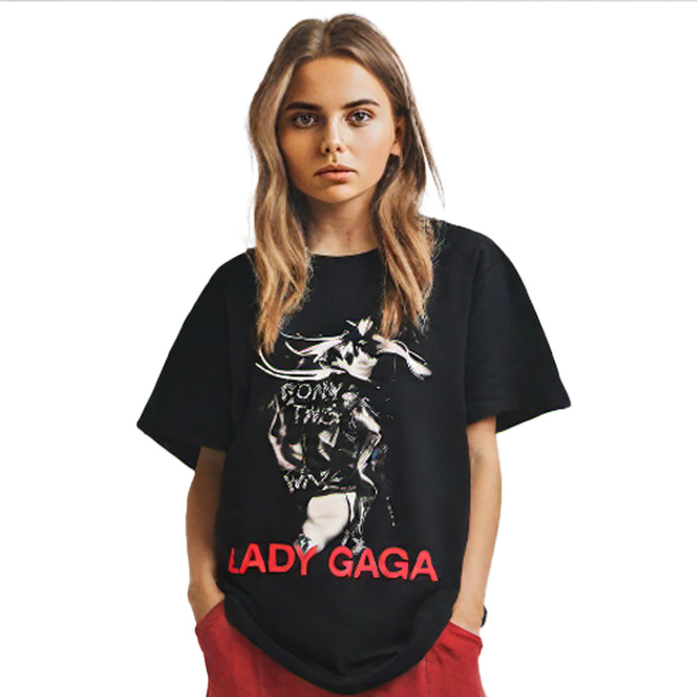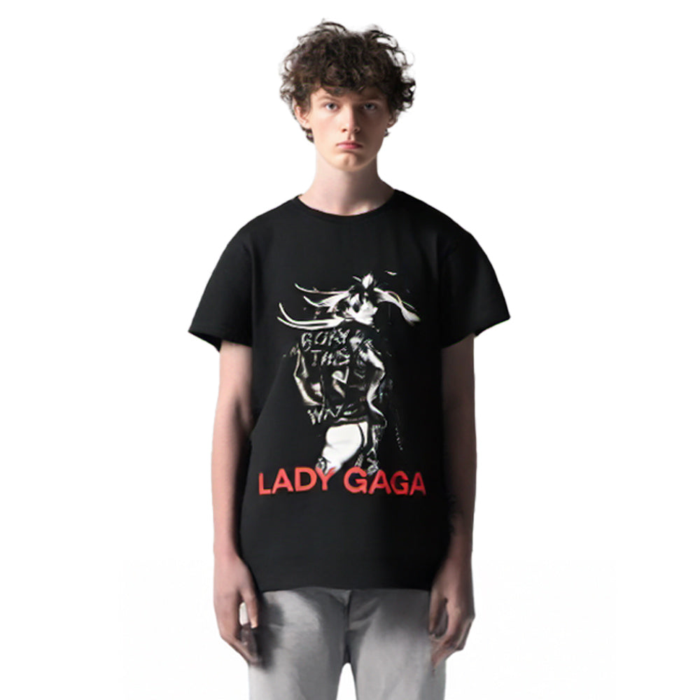 Lady Gagaのアイコニックなスタイルを象徴する"レザージャケット"モチーフを大胆にプリントした公式Tシャツ。