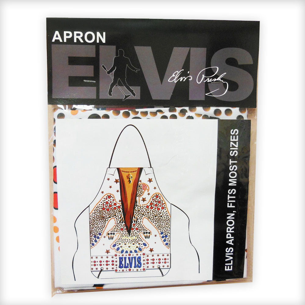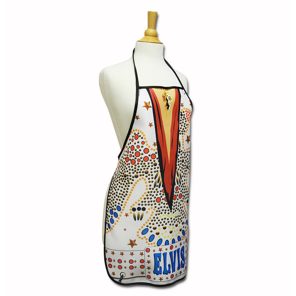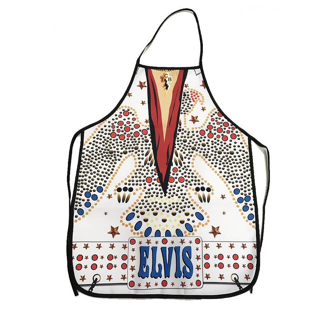 "キング・オブ・ロックンロール"ことElvis Presleyの象徴的なホワイトジャンプスーツをモチーフにした、公式ライセンスのキッチンエプロン。