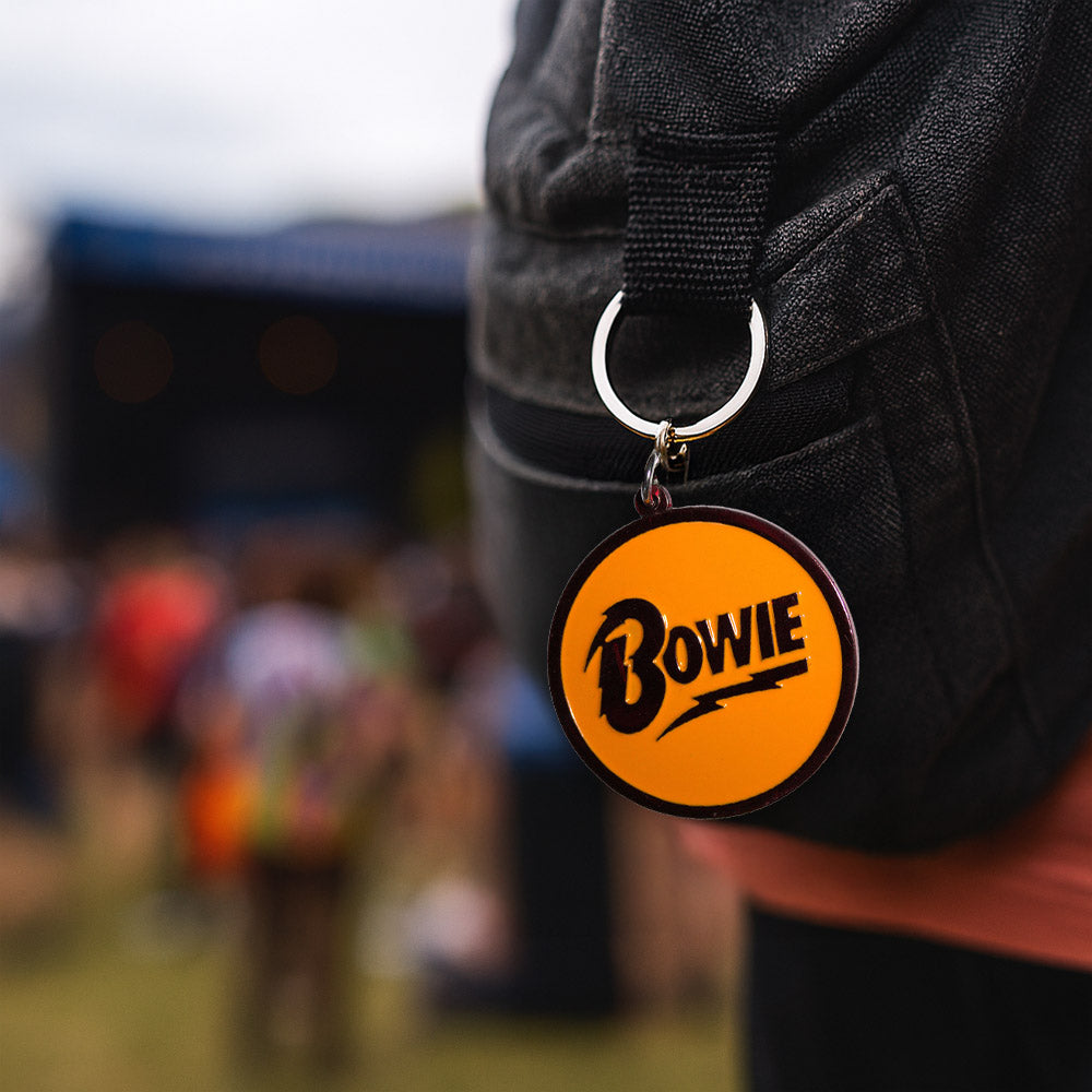 David Bowieのクラシックなサークルロゴをモチーフにしたキーチェーン。