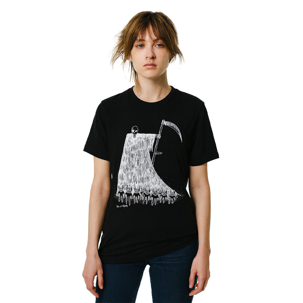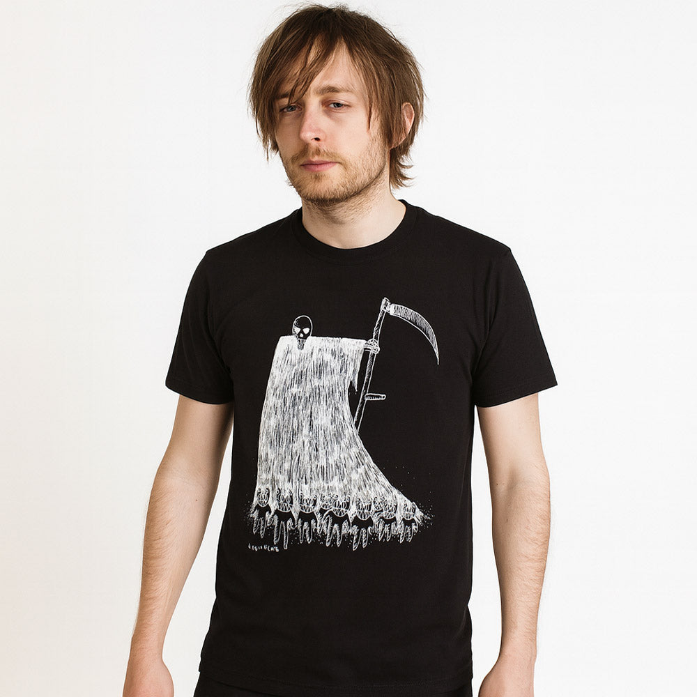 フロントには"Grim Reaper(死神)"をモチーフにしたアートワークが大胆にプリントされ、バンドの世界観を象徴するダークで印象的なデザインに仕上がっています。