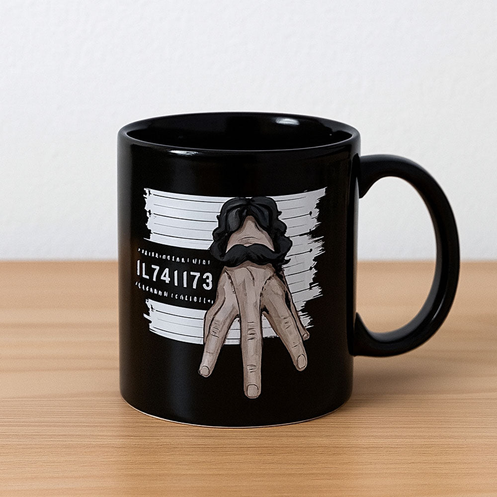 Netflixシリーズ『ウェンズデー』のシーズン2に登場するキャラクター「Fernando Fingertips(フェルナンド・フィンガーティップス)」をモチーフにした、ブラックカラーのセラミック製マグカップ。