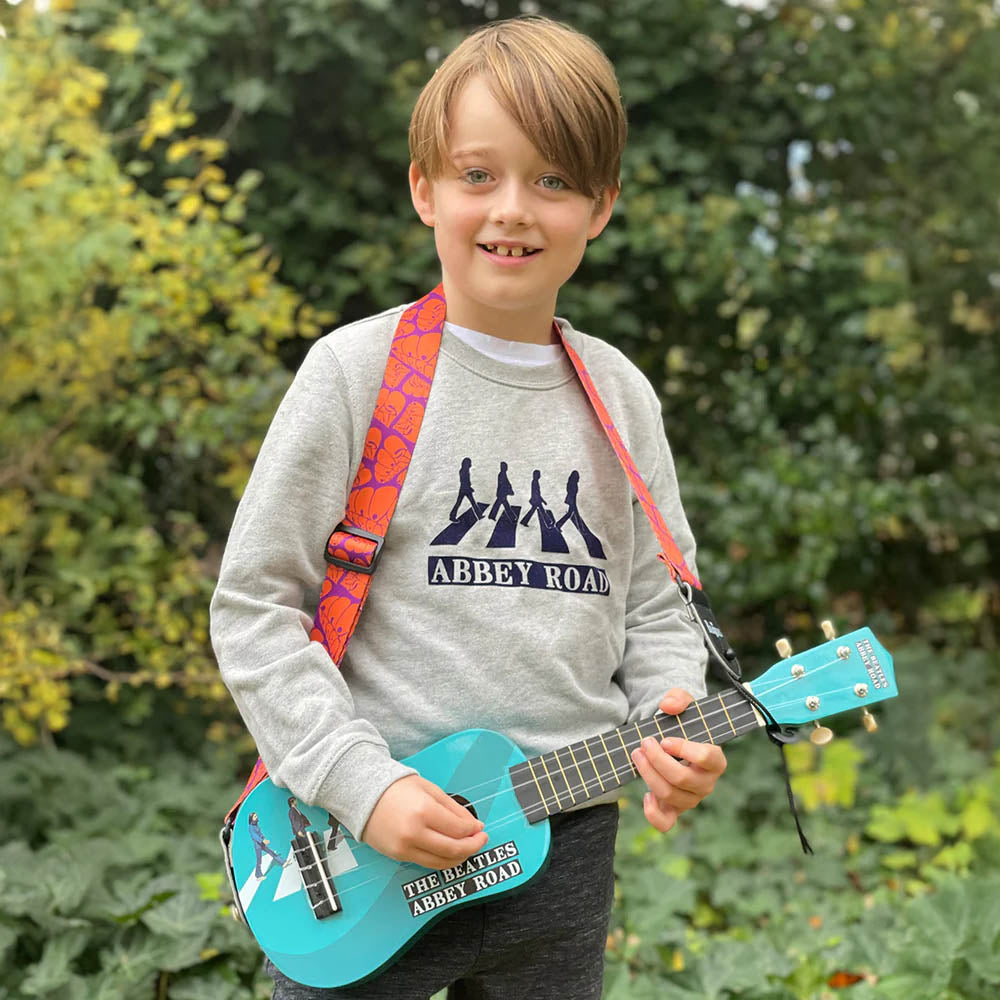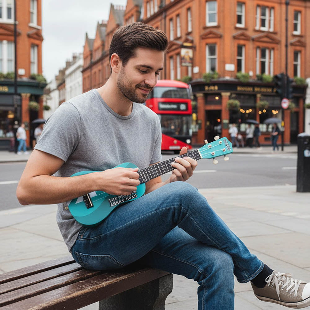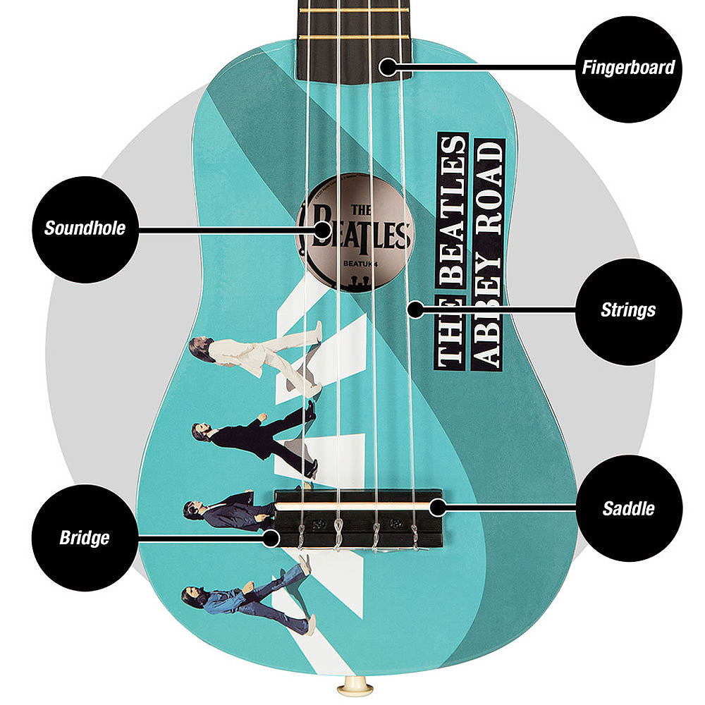 本作「Abbey Road」は、名盤ジャケットの横断歩道シーンを鮮やかなターコイズブルーのボディに描いた、ファン必携のデザインです。