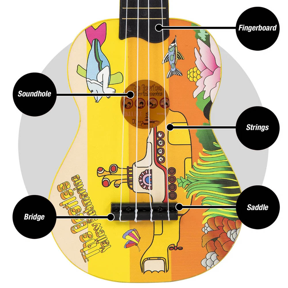 ビビッドでポップな「Yellow Submarine(イエロー・サブマリン)」柄が目を引く、ナイロン弦仕様のジュニアウクレレです。