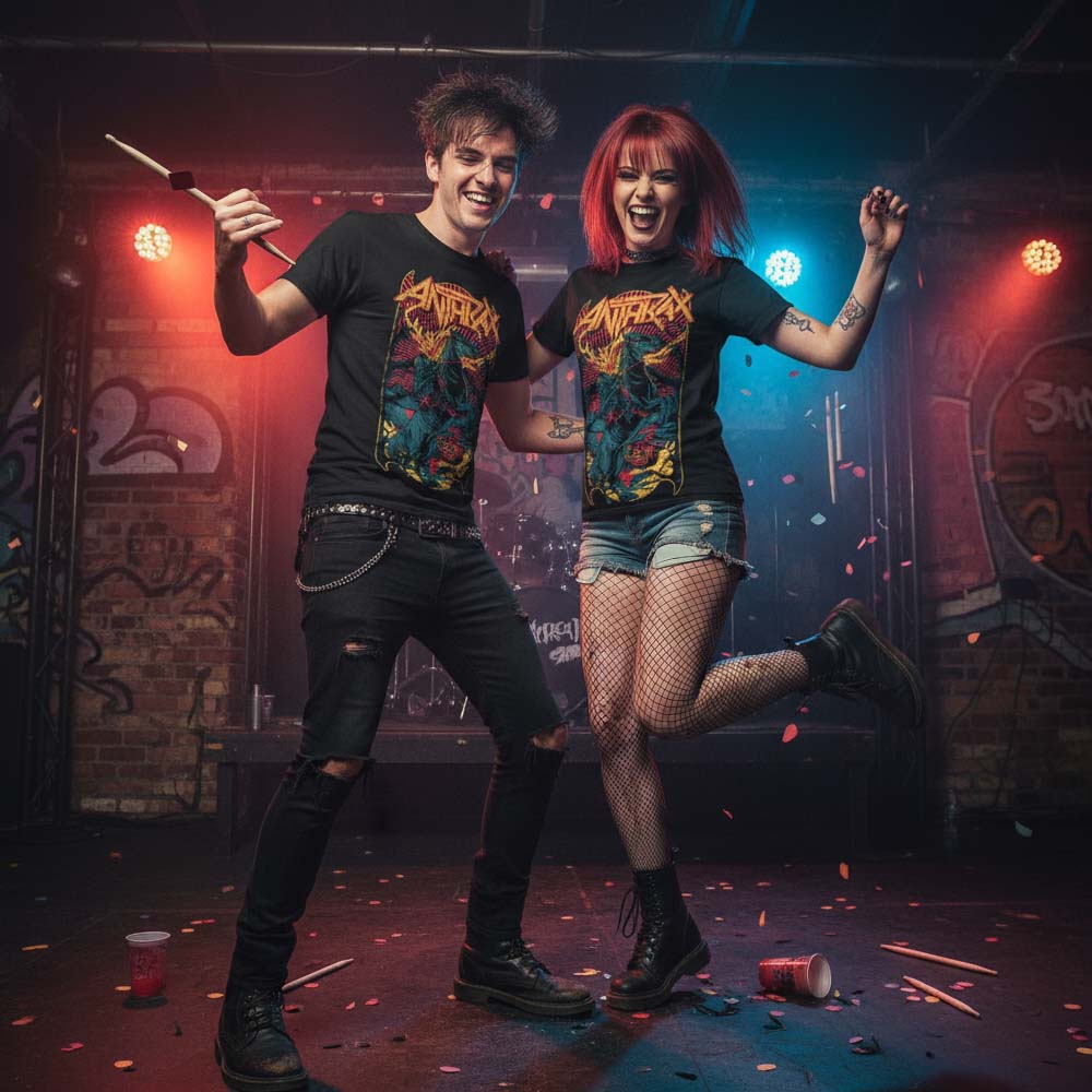 黒地に映える鮮やかなレッド・ブルー・イエローのコントラストが特徴で、ライブ参戦時はもちろん、日常のロックコーデにも取り入れやすい仕上がりです。