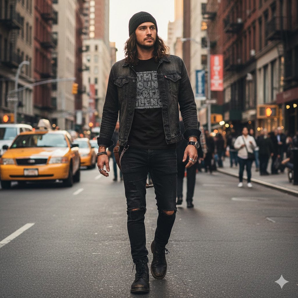 サイモン&ガーファンクルの「Silence」のグラフィックがフロントにプリントされた、ブラックのユニセックス クルーネック T シャツ。