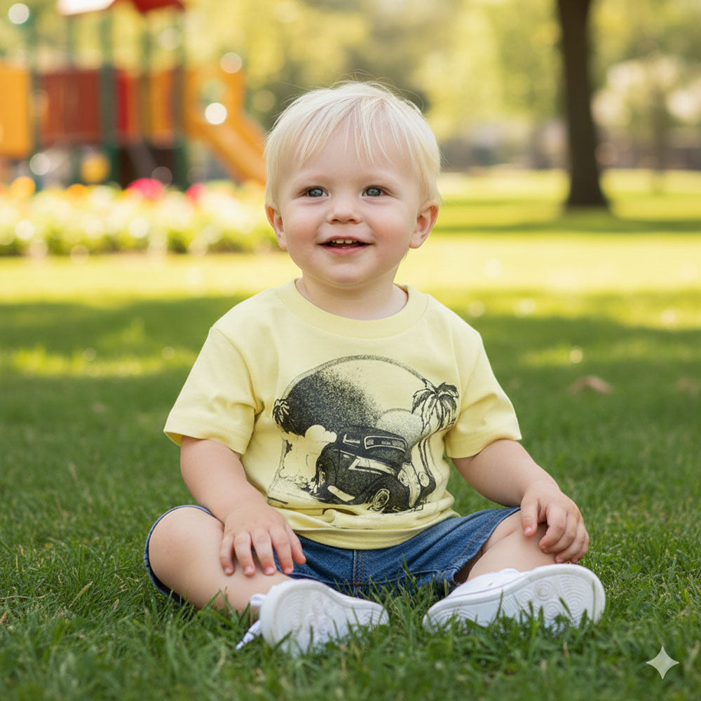 ZZ TOPの代表作『Eliminator』期を彷彿とさせる、ホットロッド×南国モチーフを落とし込んだキッズ向け公式Tシャツ。
