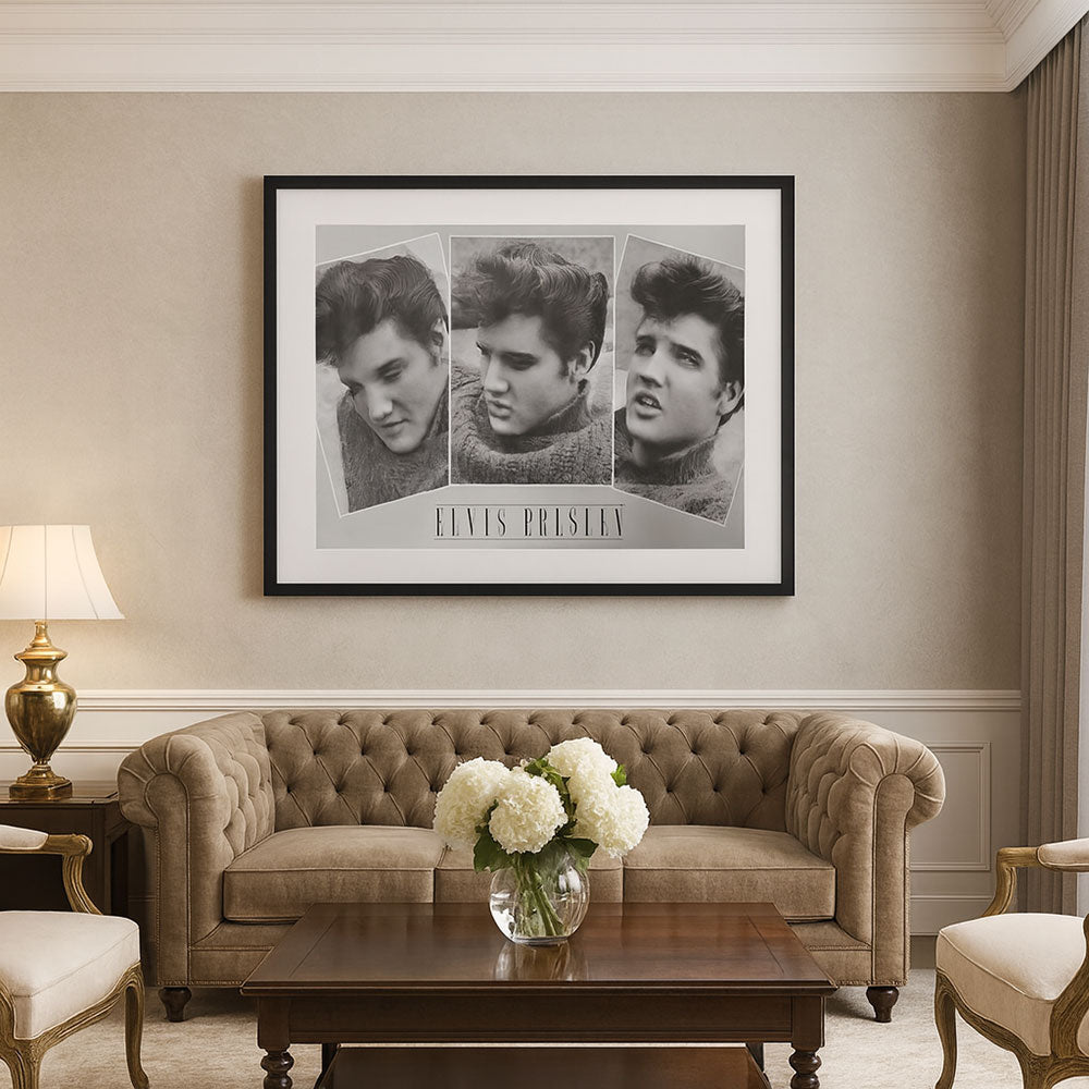 エルヴィスがざっくり編みのスウェーターに身を包み、穏やかな表情から切ない視線まで、三つの表情で魅せる名作ポスターです。