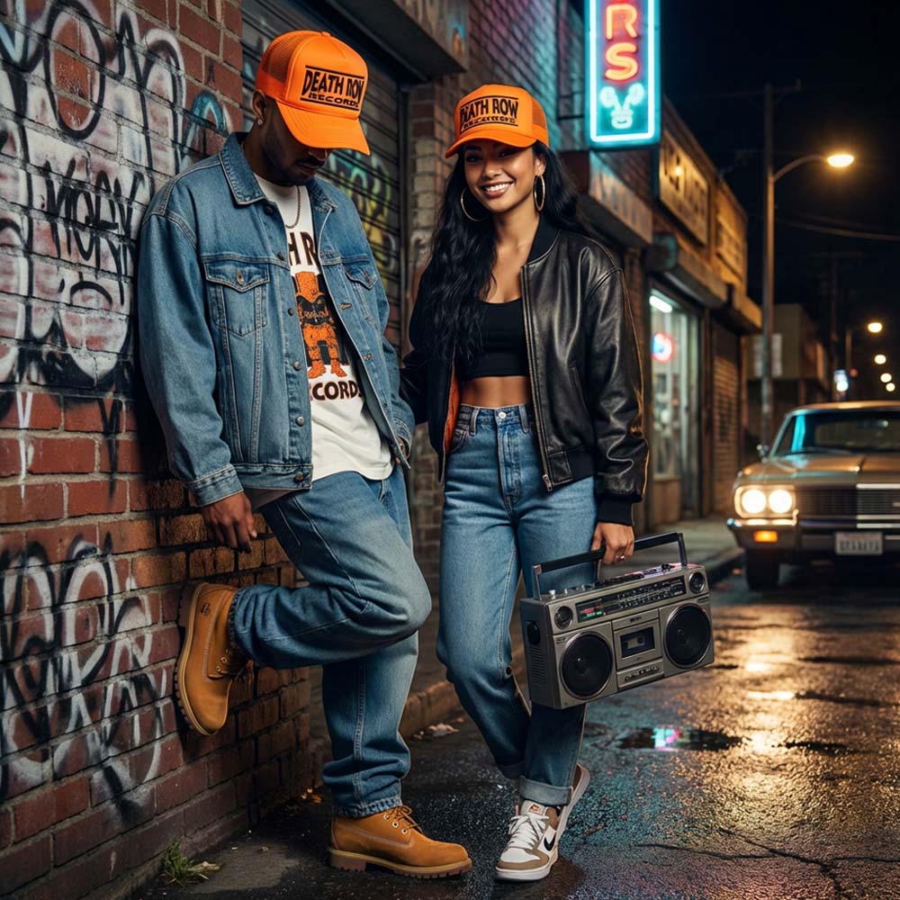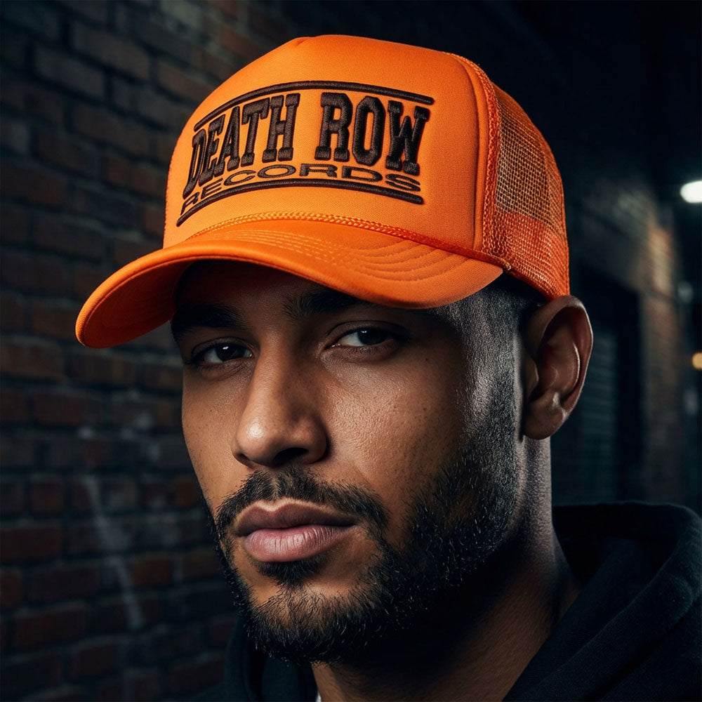 90年代ウエストコースト・ヒップホップの象徴、DEATH ROW RECORDS の存在感を、より大胆に表現したオレンジカラーのメッシュバックキャップ。