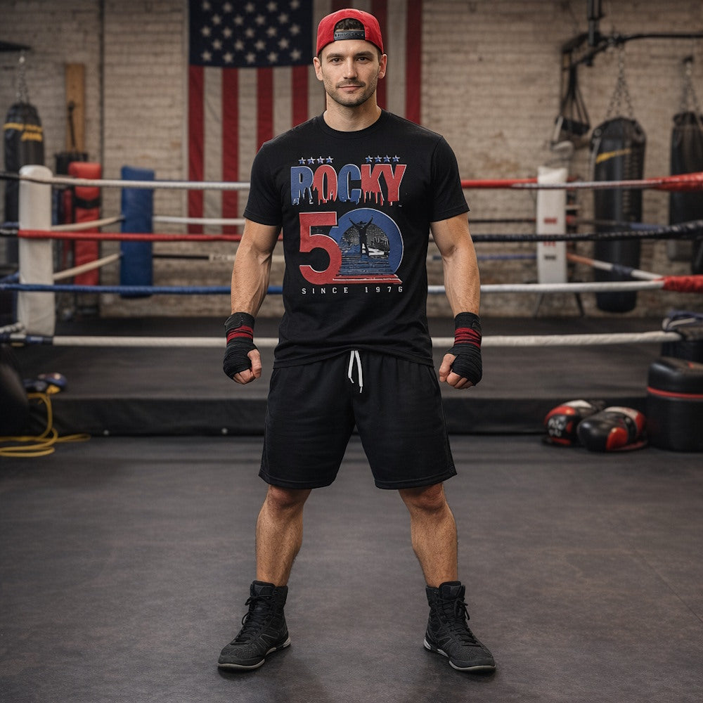 フィラデルフィア美術館前の階段を駆け上がり、両手を掲げるロッキーのシルエットを大胆に配置。ROCKY 50 / SINCE 1976 のタイポグラフィと星モチーフが、アメリカンドリームの象徴性を強く打ち出します。