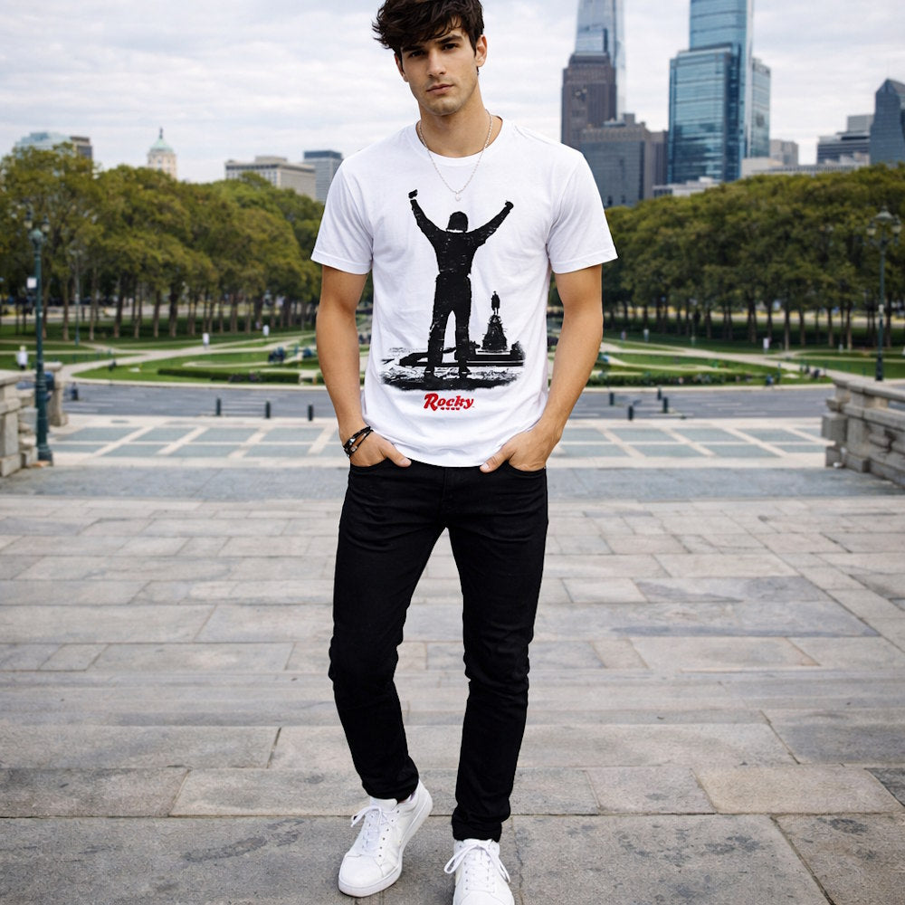 フィラデルフィア美術館の階段で、両拳を突き上げるロッキーの後ろ姿を描いた公式Tシャツです。