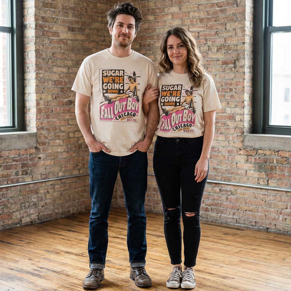 2000年代オルタナティブ/エモシーンを象徴する FALL OUT BOY の代表曲「Sugar, We’re Goin Down」の世界観を落とし込んだリリックTシャツ。